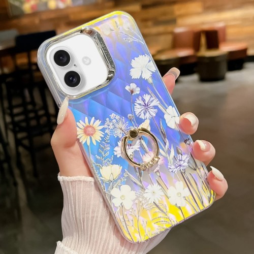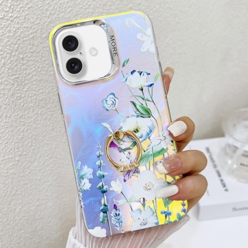 For iPhone 16 Plus Electroplating Laser Flower Ring Holder TPU Phone Case(Blue Flower AH8)
