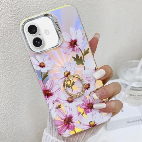 For iPhone 16 Plus Electroplating Laser Flower Ring Holder TPU Phone Case(Cosmos Flower AH7)