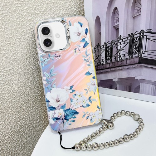 For iPhone 16 Plus Electroplating Laser Flower Phone Case with Wrist Strap(White Flower AH10)
