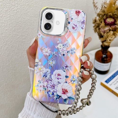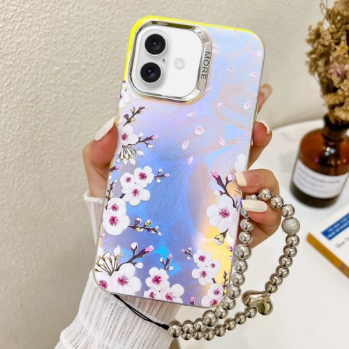 For iPhone 16 Plus Electroplating Laser Flower Phone Case with Wrist Strap(Plum Blossom AH18)