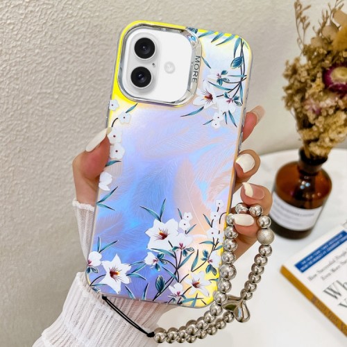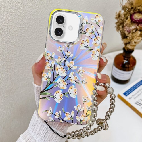For iPhone 16 Plus Electroplating Laser Flower Phone Case with Wrist Strap(Pear Blossom AH17)