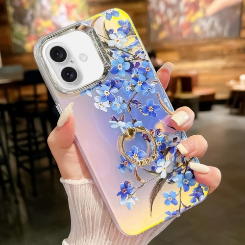 For iPhone 16 Plus Electroplating Laser Flower Ring Holder TPU Phone Case(Myosotis AH2)