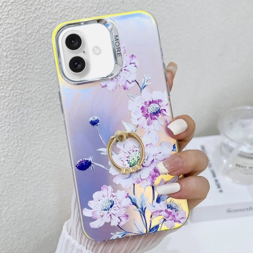 For iPhone 16 Plus Electroplating Laser Flower Ring Holder TPU Phone Case(Zinnia AH9)