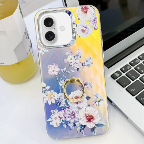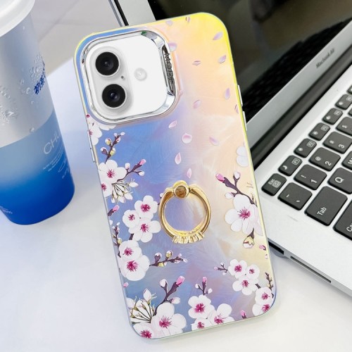 For iPhone 16 Plus Electroplating Laser Flower Ring Holder TPU Phone Case(Plum Blossom AH18)