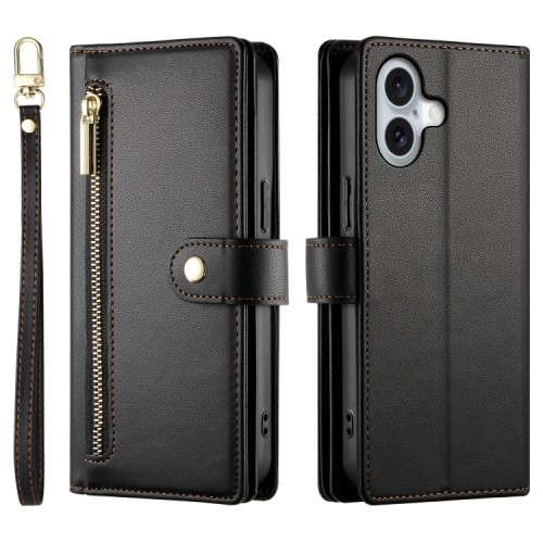 For iPhone 16 Plus Nine Card-slot Zipper Wallet Bag Leather Phone Case(Black)