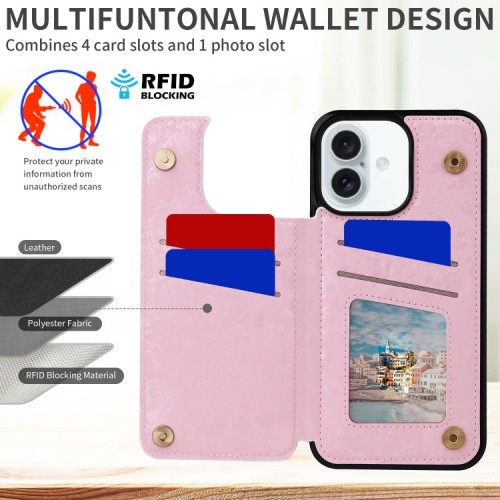 For iPhone 16 Plus Printed Double Buckle RFID Anti-theft Phone Case(Rose)