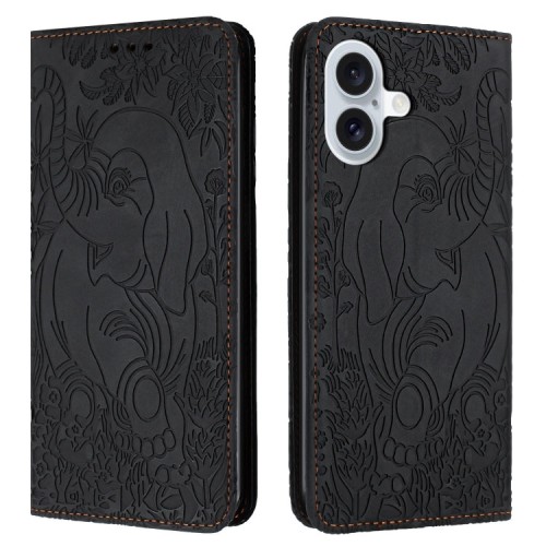 For iPhone 16 Plus Retro Elephant Embossed Leather Phone Case(Black)