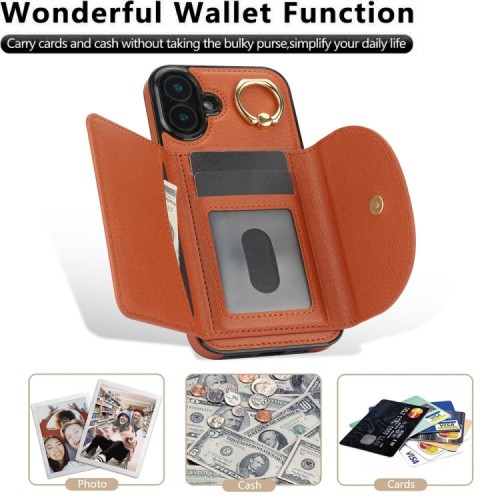 For iPhone 16 Plus YM007 Ring Holder Card Bag Skin Feel Phone Case(Brown)