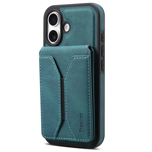 DENIOR D19 For iPhone 16 Plus Magnetic Case Leather+PC+TPU Cover with Detachable Card Bag – Blue