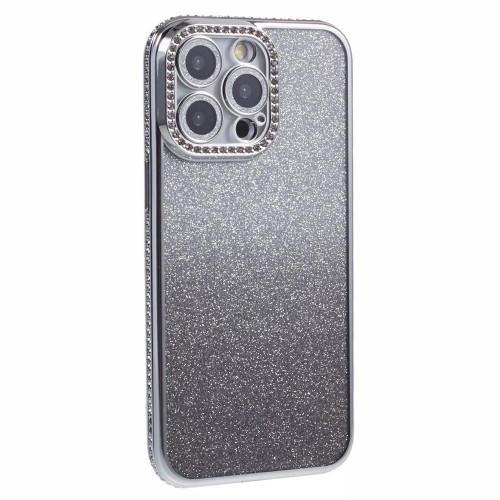 For iPhone 15 Pro Max Case Camera Lens Guard Clear Phone Back Cover Rhinestone Decor With Glitter Paper – Gradient Black