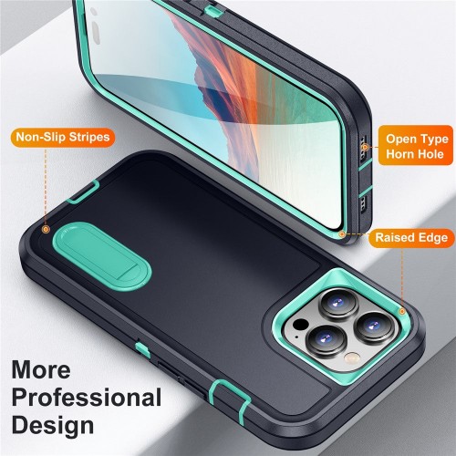 For iPhone 15 Pro Max Shockproof Phone Case Anti-Drop PC+TPU Cell Phone Cover with Kickstand – Black / Cyan