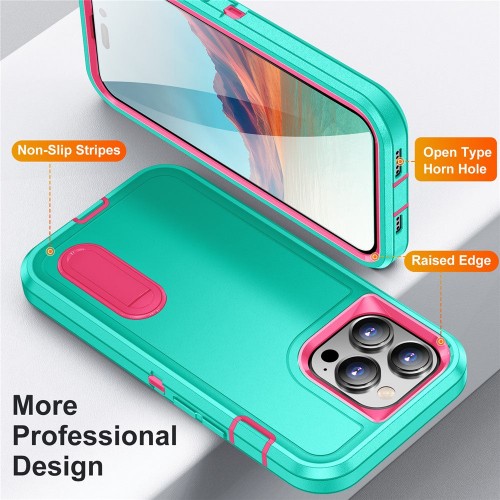 For iPhone 15 Pro Max Shockproof Phone Case Anti-Drop PC+TPU Cell Phone Cover with Kickstand – Cyan / Rose