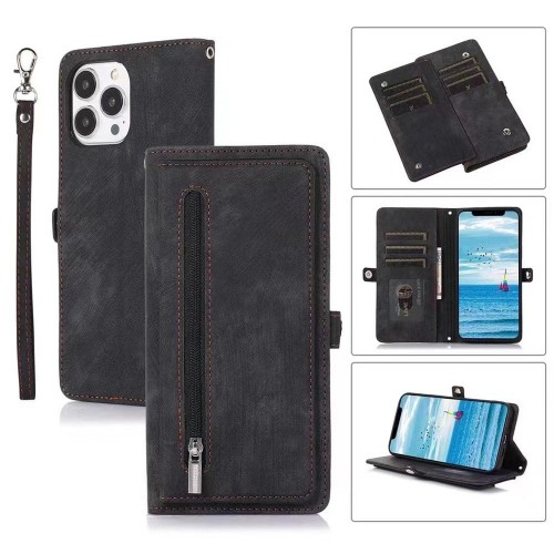 For iPhone 15 Pro Max Stand Wallet Case 9 Card Slots Zipper Pocket PU Leather Phone Cover with Strap – Purple