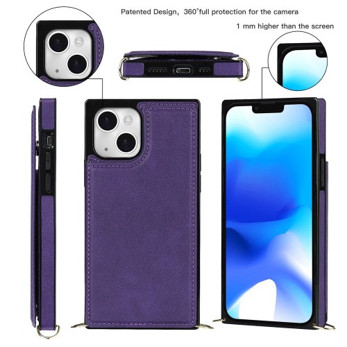 For iPhone 15 RFID Blocking Card Holder Back Cover Kickstand Phone Case with Shoulder Strap – Purple