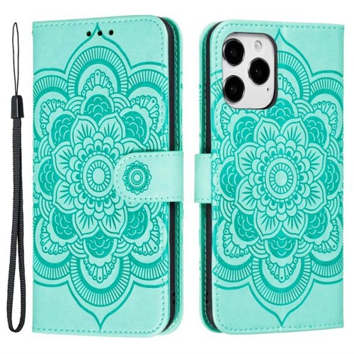 For iPhone 16 Case PU Leather Mandala Imprinted Design Wallet Phone Cover – Black