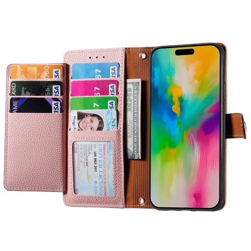For iPhone 16 Case RFID Blocking Zipper Pocket Leather Wallet Phone Cover – Pink