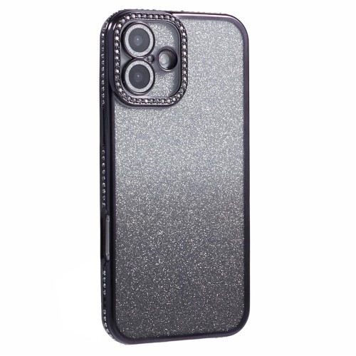 For iPhone 16 Full Protection Case With Camera Lens Protector Rhinestone Embellished Clear Cover – Black