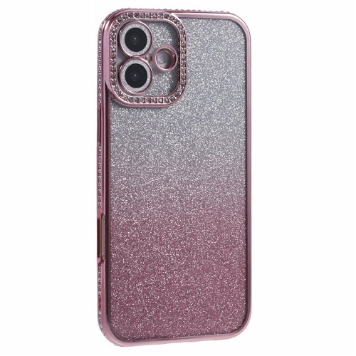 For iPhone 16 Plus Case Camera Lens Guard Clear Phone Back Cover Rhinestone Decor With Glitter Paper – Pink