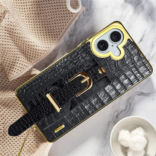 For iPhone 16 Plus Case Crocodile Texture PU Leather+TPU Electroplating Phone Cover Wristband Kickstand – Black
