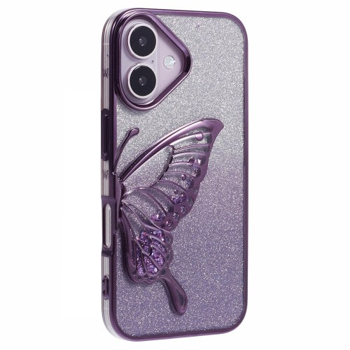 For iPhone 16 Plus Case Quicksand Butterfly TPU Phone Cover with Glass Lens Film – Silver