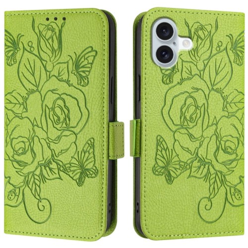 For iPhone 16 Plus Embossed Rose RFID Anti-theft Leather Phone Case(Green)