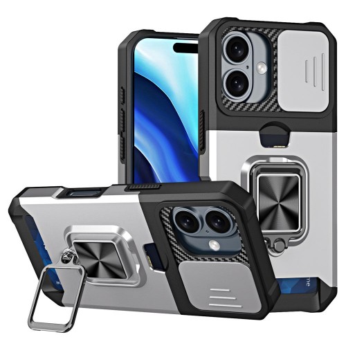 For iPhone 16 Plus Kickstand Case Slide Lens Lid PC+TPU Phone Cover with Card Slot – Gold