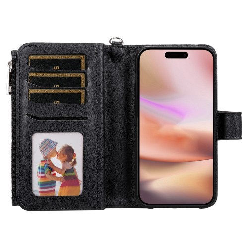 For iPhone 16 Plus Magnetic Leather Case Mobile Cover with Detachable Zipper Wallet Strap – Black