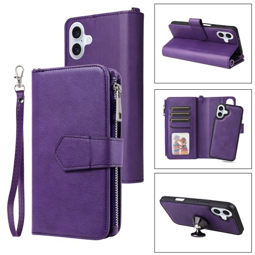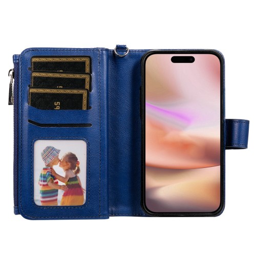 For iPhone 16 Plus Magnetic Leather Case Mobile Cover with Detachable Zipper Wallet Strap – Blue
