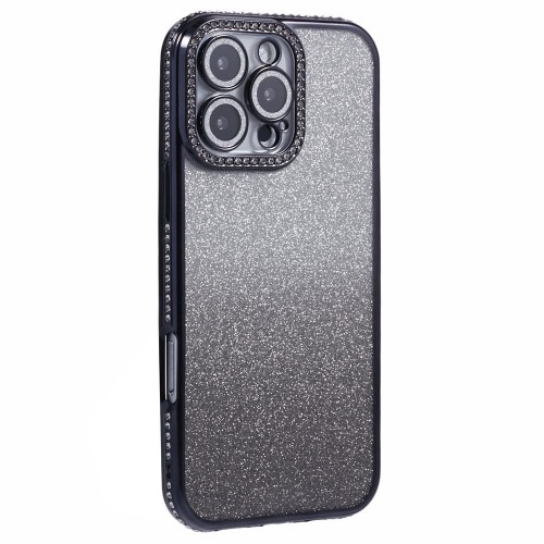 For iPhone 16 Pro Case Camera Lens Guard Clear Phone Back Cover Rhinestone Decor With Glitter Paper – Black