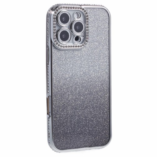 For iPhone 16 Pro Case Camera Lens Guard Clear Phone Back Cover Rhinestone Decor With Glitter Paper – Gradient Black