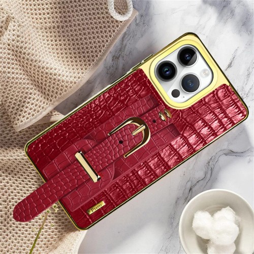 For iPhone 16 Pro Case Crocodile Texture PU Leather+TPU Electroplating Phone Cover Wristband Kickstand – Red