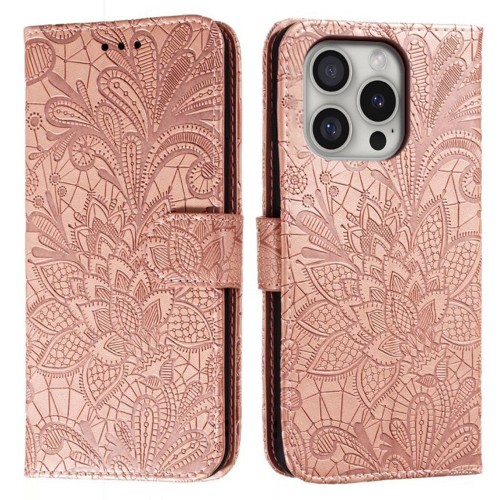 For iPhone 16 Pro Case Lace Flowers PU Leather Flip Wallet Phone Cover – Grey