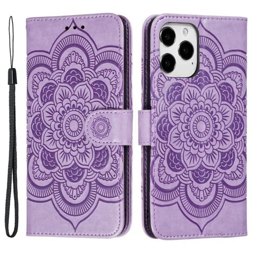 For iPhone 16 Pro Case PU Leather Mandala Imprinted Design Wallet Phone Cover – Black