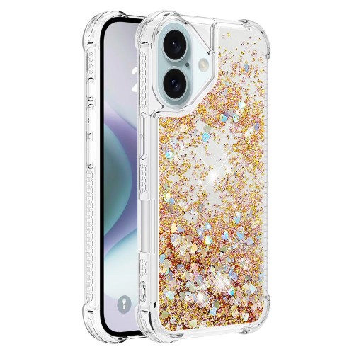 For iPhone 16 TPU Case Glitter Quicksand Shockproof Phone Back Cover – Rose Gold / Hearts