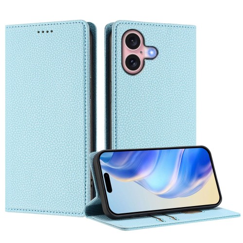 For iPhone 16 Wallet Case RFID Blocking Litchi Texture Leather Mobile Cover – Baby Blue