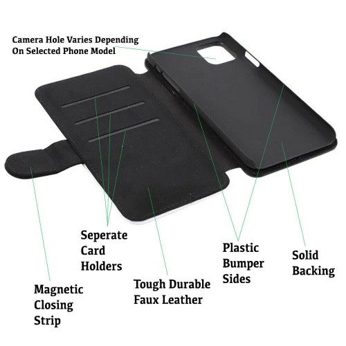 A strong, durable front cover with two credit card slots plus allocated holes to allow the camera and charging ports to still be used while the case is on the phone.The design is printed into the front cover itself so the picture quality and colouring will never fade over time. Magnetic lock sealing strip which gives the phone extra protection when not being used.