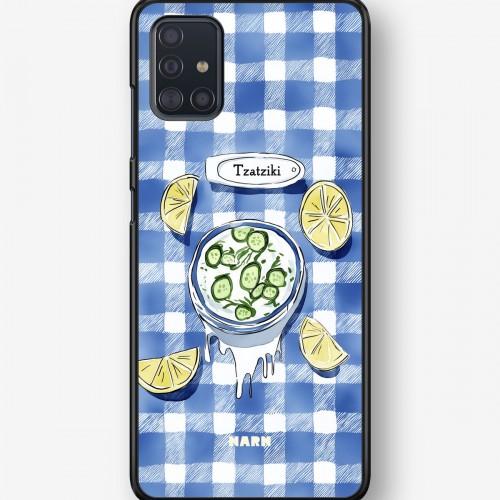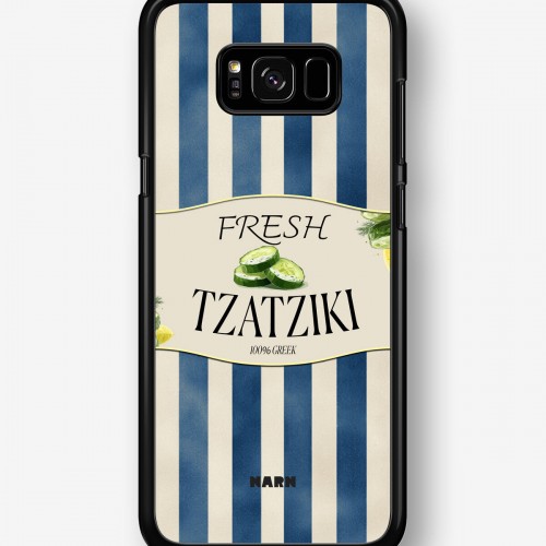 This design features: cucumber, lemon, greek, stripes, tzatziki