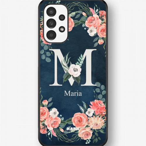 This design features: watercolor flowers, floral pattern, navy blue, monogram, romantic
