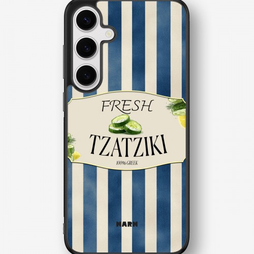 This design features: cucumber, lemon, greek, stripes, tzatziki