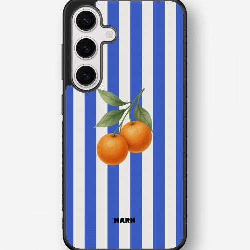 This design features: oranges, blue, citrus, white, stripes