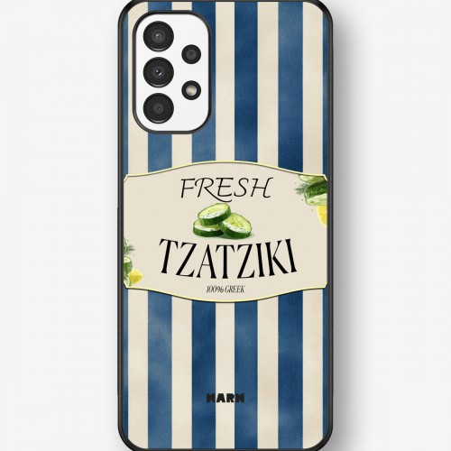 This design features: cucumber, lemon, greek, stripes, tzatziki
