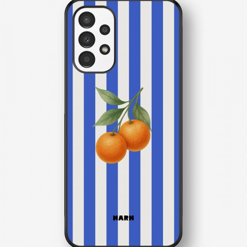 This design features: oranges, blue, citrus, white, stripes