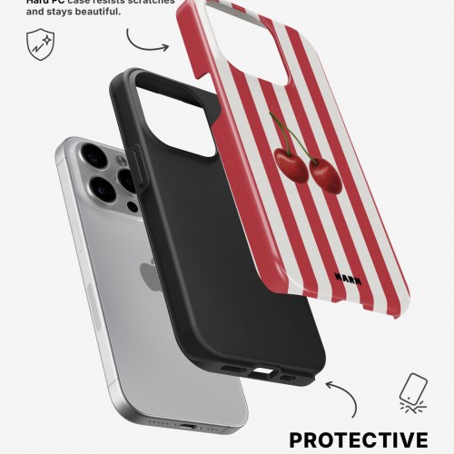 Meet the Tough Case for iPhone 13 Pro Max in the pattern: Cherry Stripes. Strong on the outside, soft on the inside. This case is made to protect your phone from daily drops, scratches and surprises while keeping it stylish.
