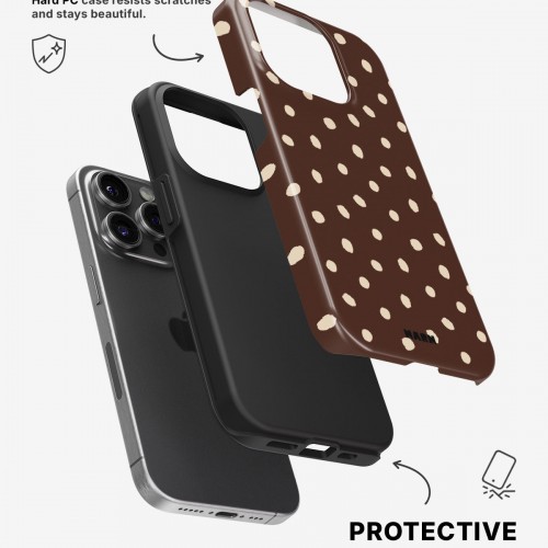 Meet the Tough Case for iPhone 14 Pro in the pattern: Choco Dots. Strong on the outside, soft on the inside. This case is made to protect your phone from daily drops, scratches and surprises while keeping it stylish.