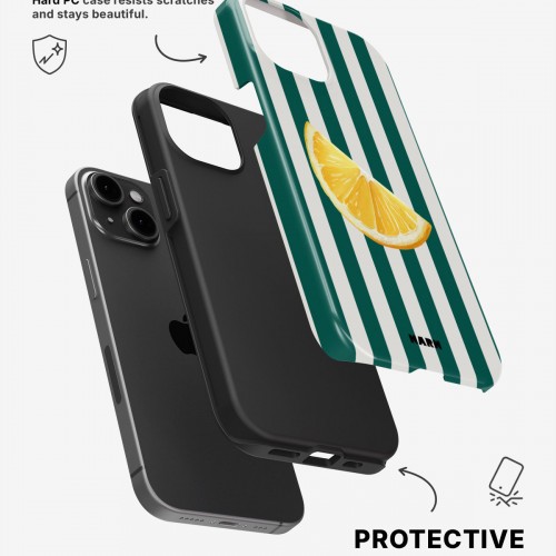 Meet the Tough Case for iPhone 14 in Lemon Stripes. Strong on the outside, soft on the inside. This case is made to protect your phone from daily drops, scratches and surprises while keeping it stylish.