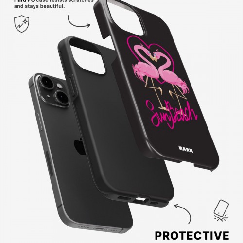 Meet the Tough Case for iPhone 15 Plus in the pattern: Beach Flamingo. Strong on the outside, soft on the inside. This case is made to protect your phone from daily drops, scratches and surprises while keeping it stylish.
