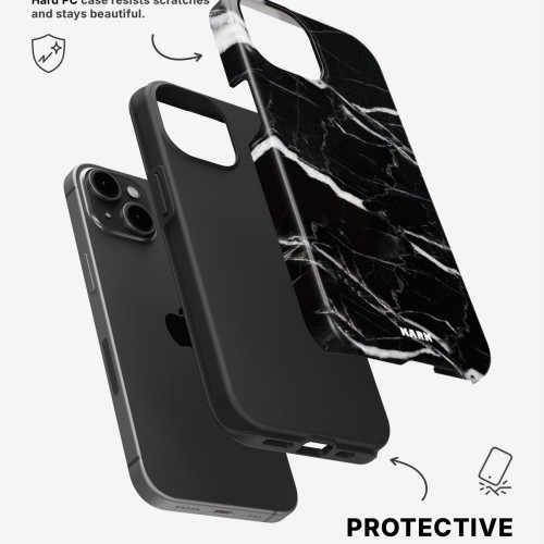 Meet the Tough Case for iPhone 15 Plus in the pattern: Black Marble. Strong on the outside, soft on the inside. This case is made to protect your phone from daily drops, scratches and surprises while keeping it stylish.