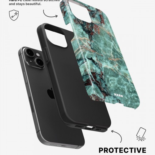 Meet the Tough Case for iPhone 15 Plus in the pattern: Green Marble. Strong on the outside, soft on the inside. This case is made to protect your phone from daily drops, scratches and surprises while keeping it stylish.