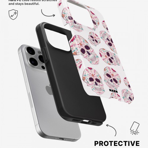 Meet the Tough Case for iPhone 15 Pro in Calavera Skulls. Strong on the outside, soft on the inside. This case is made to protect your phone from daily drops, scratches and surprises while keeping it stylish.