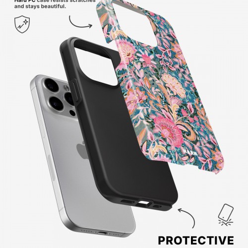 Meet the Tough Case for iPhone 15 Pro in Fantasy Flowers. Strong on the outside, soft on the inside. This case is made to protect your phone from daily drops, scratches and surprises while keeping it stylish.